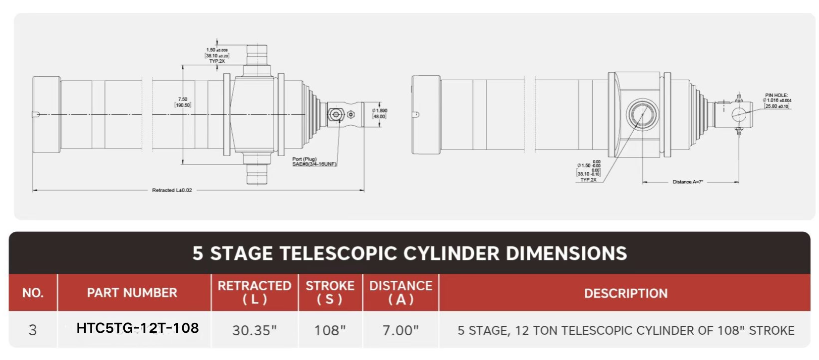 "HTC5TG-12T-108", 5-степенен, 12 тона от 108" ходов телескопичен цилиндър