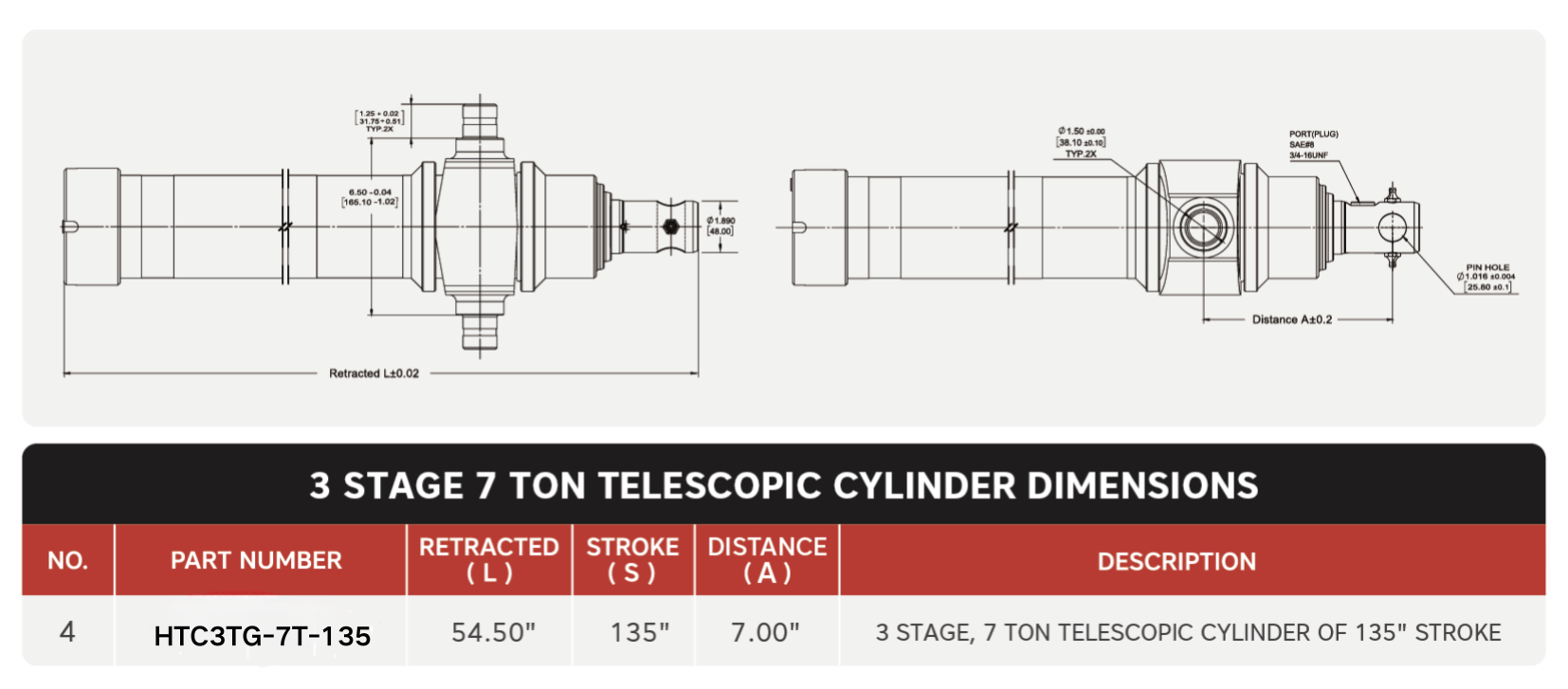 "HTC3TG-7T-135", 3 етапа, 7 тона от 135" ходови телескопични цилиндри